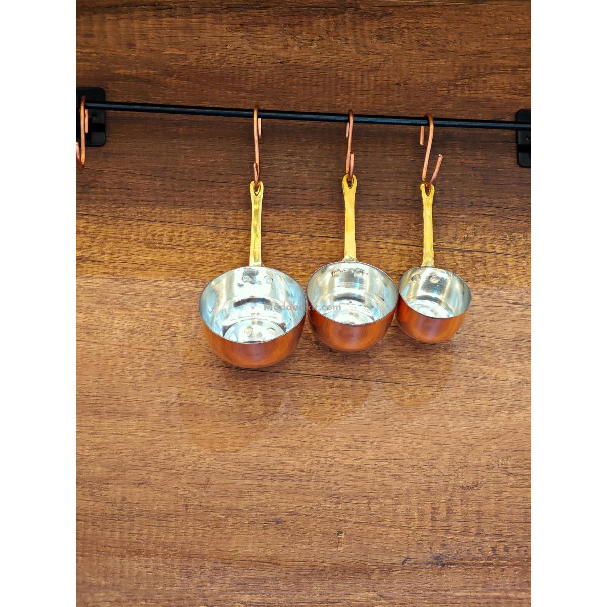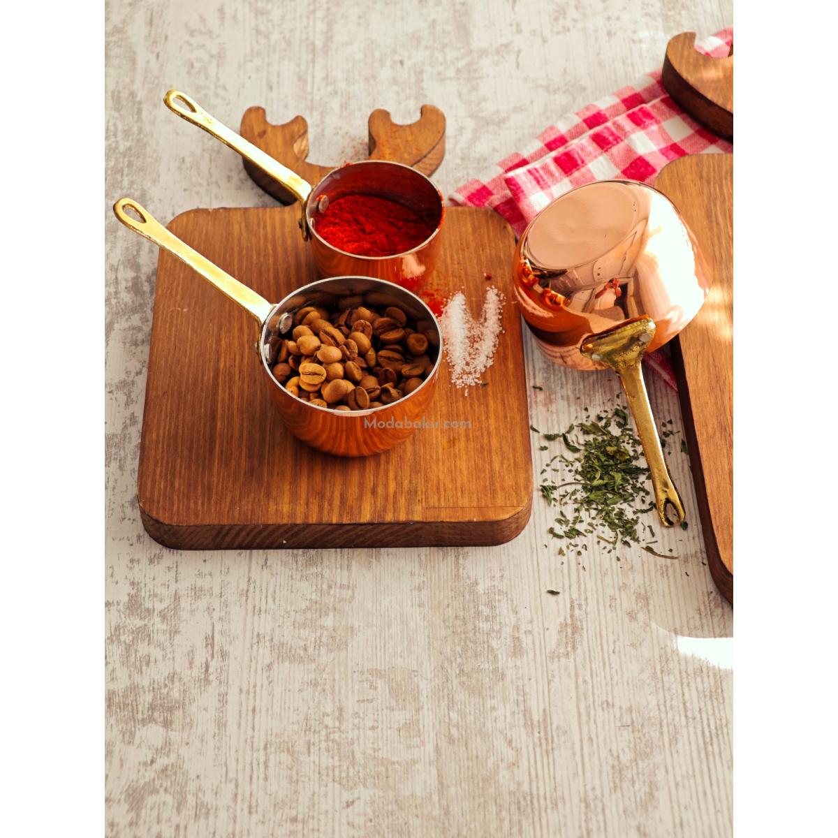 El yapımı bu bakır ölçü kabı seti, hem ölçü kabı hem de bakır ölçü kaşığı olarak kullanılabilir. %100 saf bakırdan üretilmiştir ve iç yüzeyi hijyenik kalay kaplamadır.
